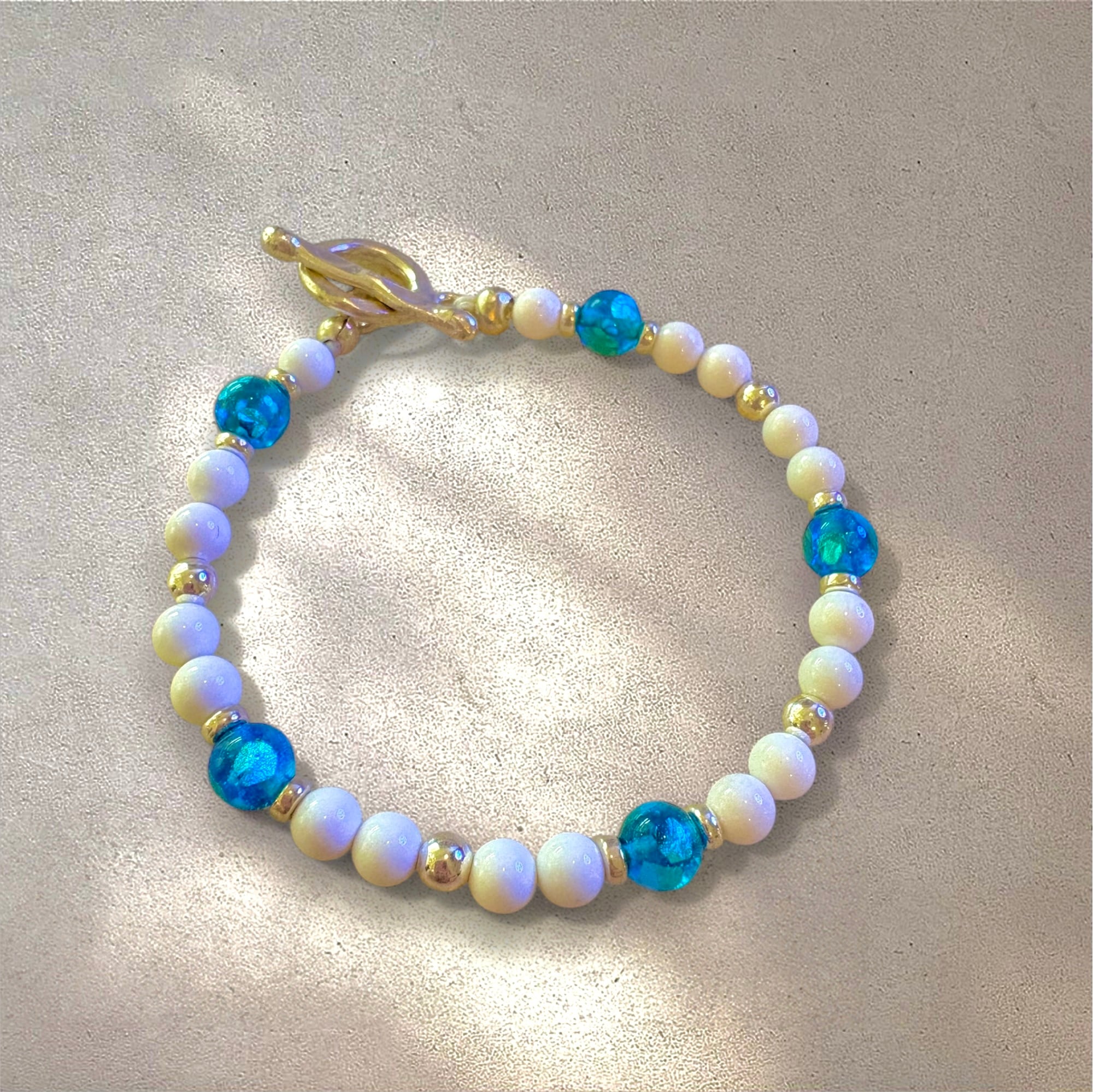 こちらのホワイトオニキスブレスレットは、純白のホワイトオニキスと美しいブルーのホタルガラスを組み合わせた、まさに目を引くアイテムです。ホワイトオニキスの清らかさとホタルガラスの輝きが絶妙に調和し、身につけるだけで自然と心が躍るようなデザインになっています。シンプルながらも存在感があり、カジュアルからフォーマルまで幅広くお楽しみいただけます。