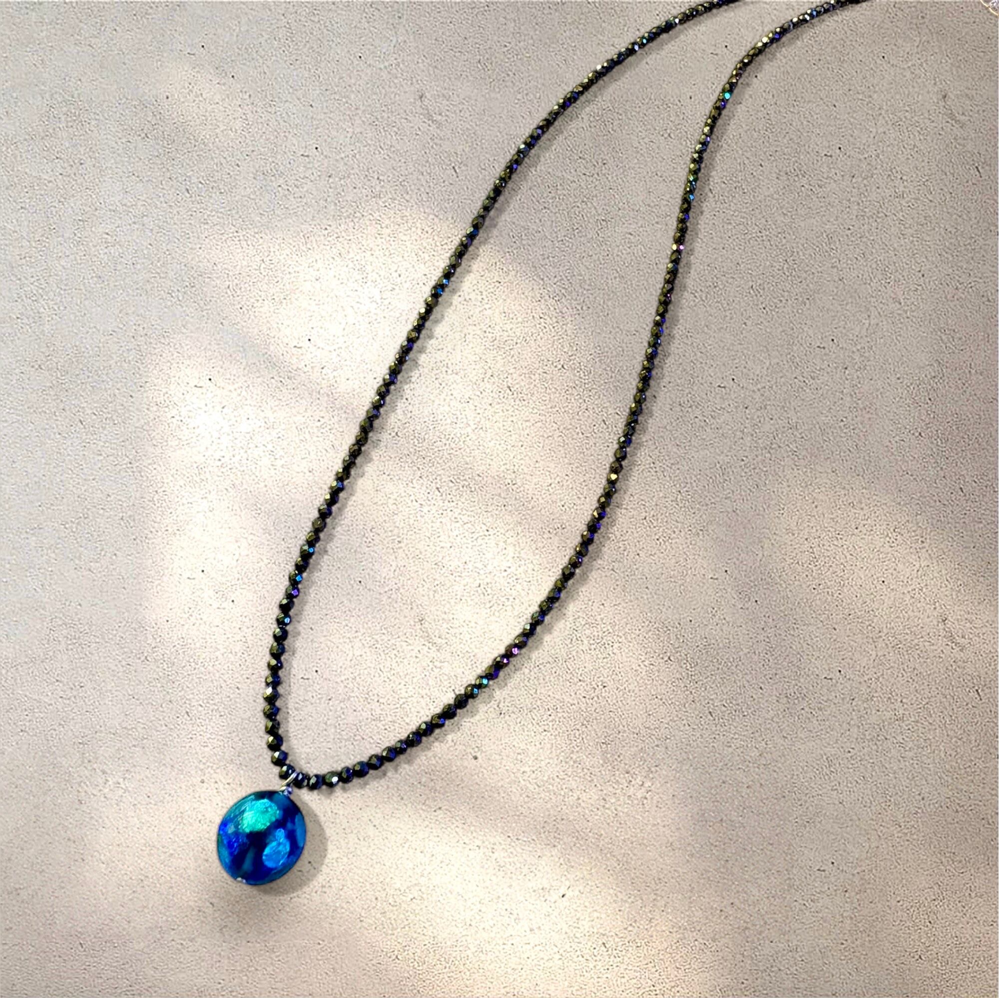 こちらのヘマタイトネックレスは、天然石のヘマタイトと光るホタルガラスを組み合わせた洗練されたデザインが特徴です。ヘマタイトの美しいカットが光を受けてキラキラと輝き、シンプルながらも存在感抜群のアイテムとなっています。男女問わず人気があり、さまざまなシーンで活躍します。