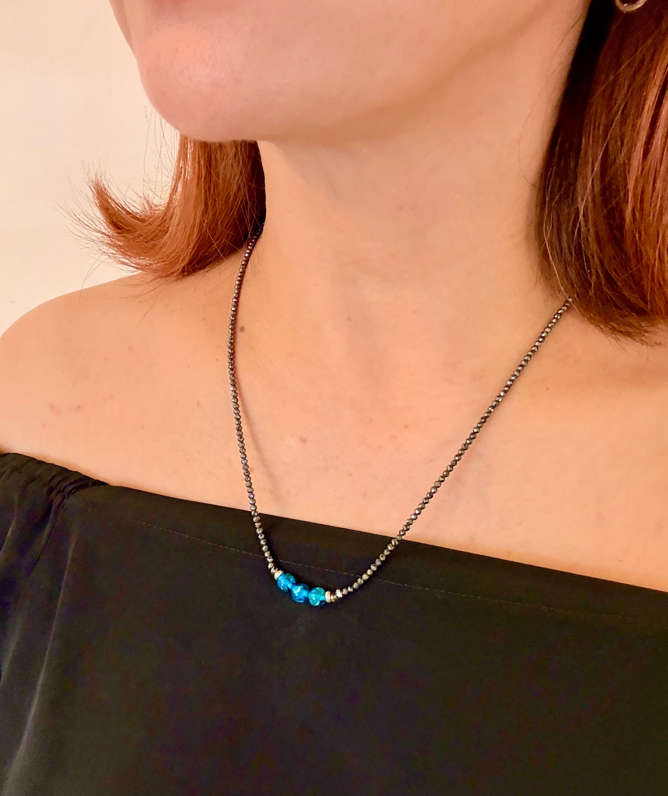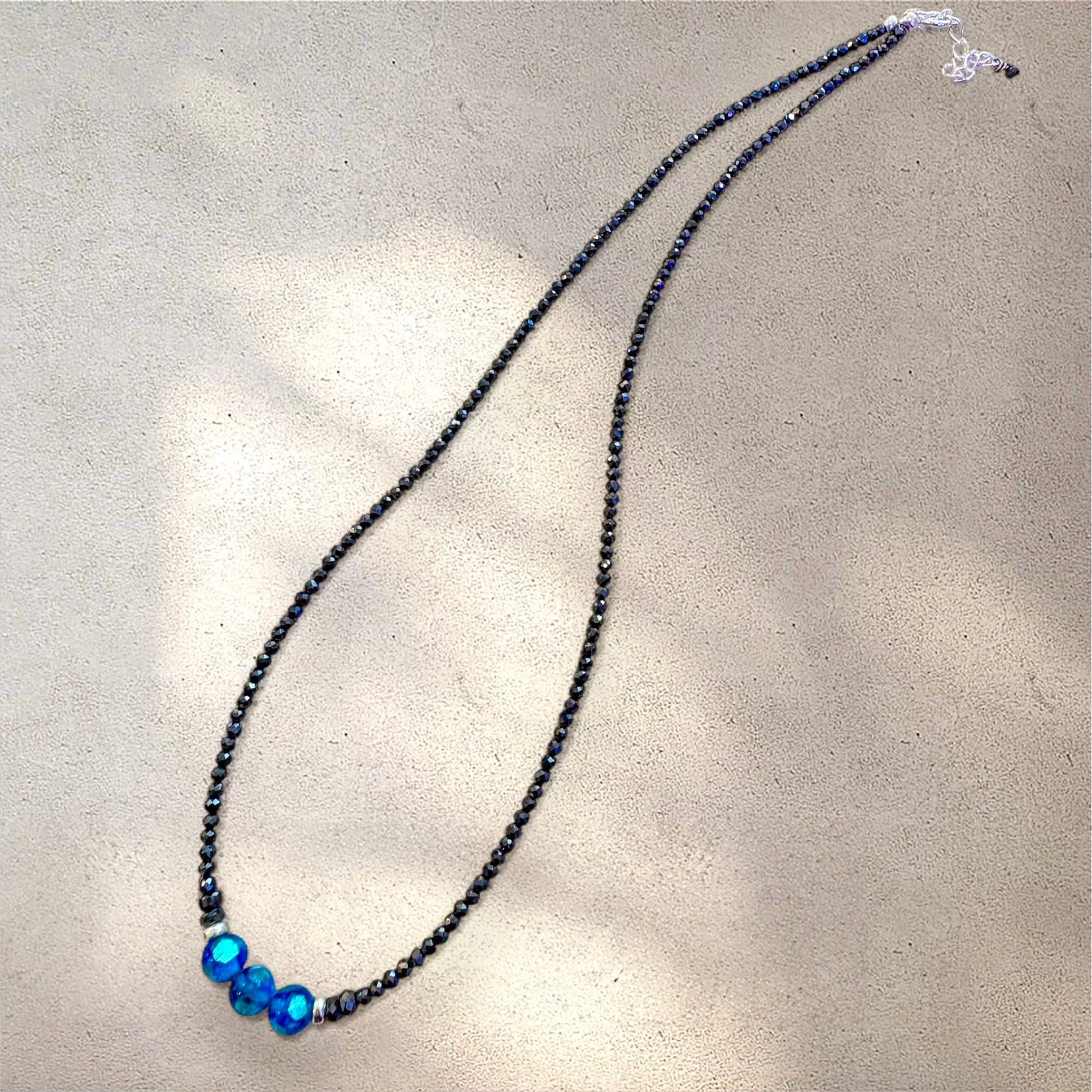 天然石のヘマタイトと光るホタルガラスを組み合わせた洗練されたデザインが特徴です。ヘマタイトの美しいカットが光を受けてキラキラと輝き、シンプルながらも存在感抜群のアイテムとなっています。男女問わず人気があり、さまざまなシーンで活躍します。