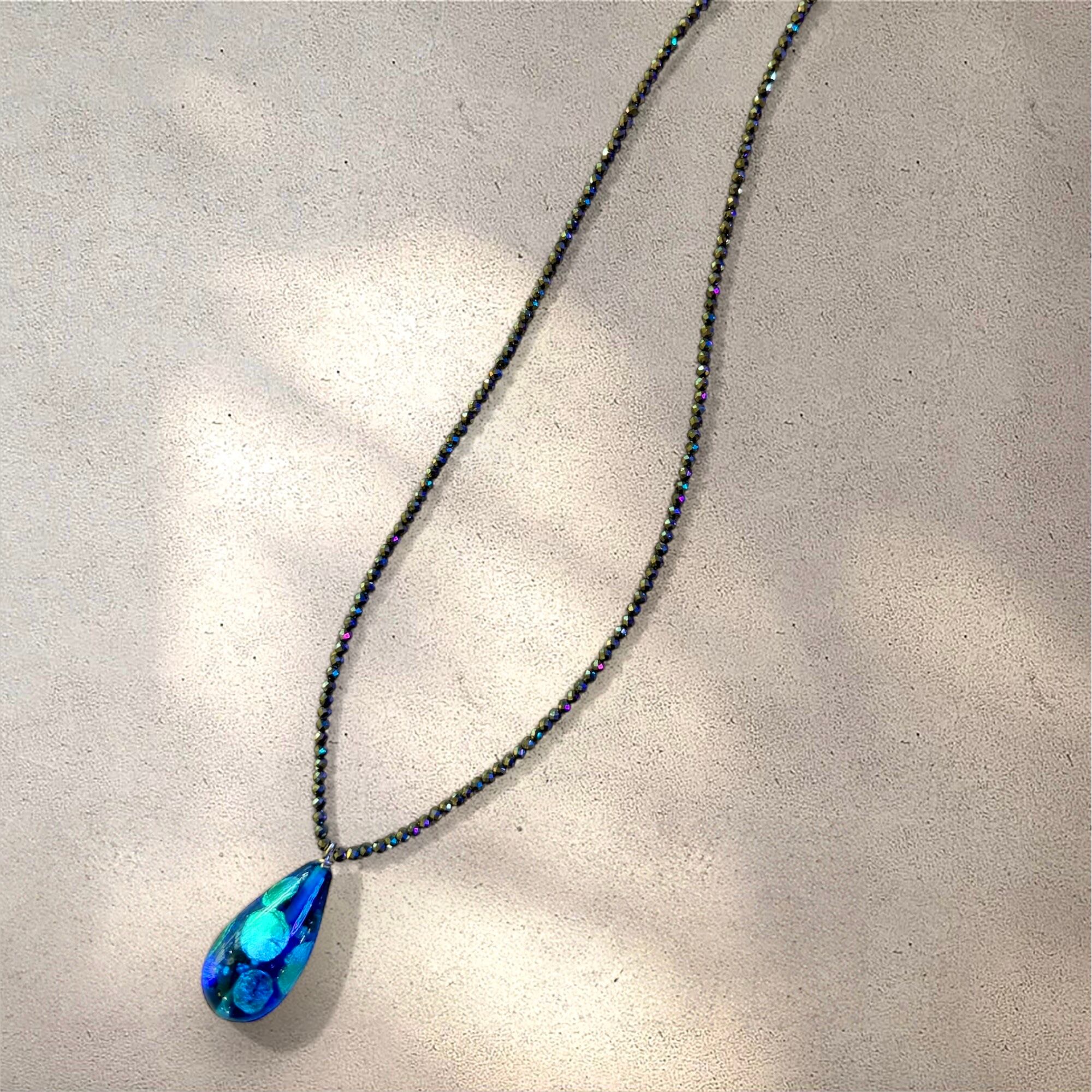 こちらのヘマタイトネックレスは、大きめの雫型の美しいブルーのホタルガラスを組み合わせた特別なデザインが魅力です。雫型のホタルガラスは、石垣島の海と空の美しさを表現し、その神秘的な色合いがヘマタイトの深い輝きと見事に調和しています。男女問わず愛されるスタイルで、普段使いから特別なシーンまで幅広く楽しむことができます。