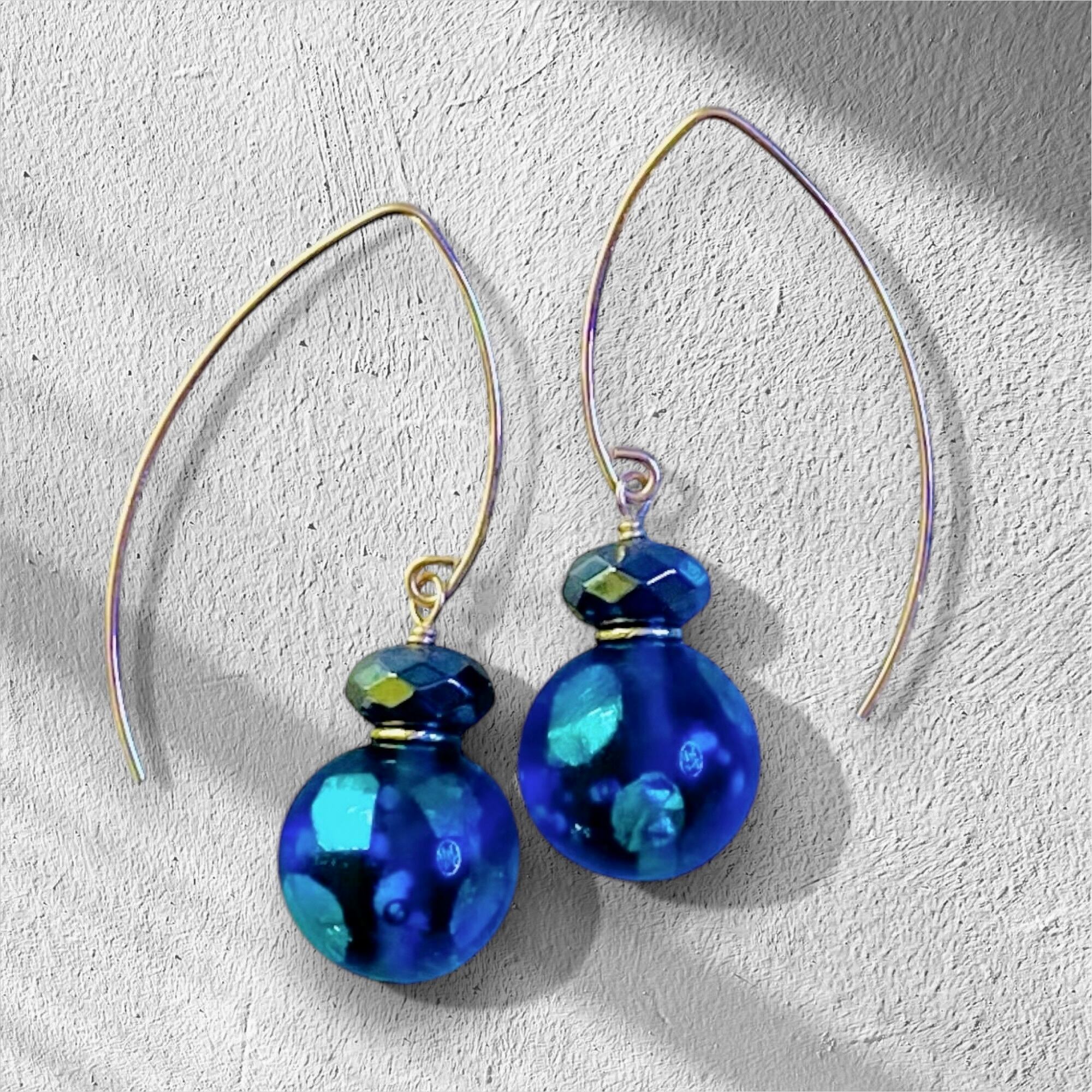 丸ピアスVフック ヘマタイト 光るホタルガラス